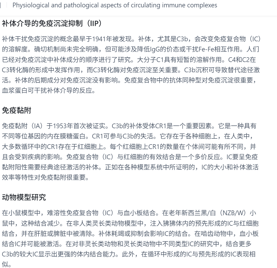 3.2 啮齿类(大鼠、小鼠等): 啮齿类红细胞缺乏类似人类的CR1受体,因此红细胞不参与免疫复合物清除。研究显示,小鼠将补体结合的免疫复合物主要通过血小板和巨噬细胞清除:在小鼠模型中,不易溶的免疫复合物倾向于与血小板结合,且可引发血小板活化。相应地,小鼠体内大的免疫复合物可能更容易在局部沉积并引发炎症。例如,一些小鼠品系(如NZB/W小鼠)随着年龄增长自发产生高滴度自身抗体和免疫复合物,出现免疫复合物介导的肾小球肾炎模型。由于缺乏红细胞介导的转运,小鼠和大鼠主要依赖单核-巨噬细胞系统直接从循环中捕获免疫复合物,清除效率可能低于灵长类。因此,啮齿类在暴露于高抗原抗体负荷时更容易出现免疫复合物沉积性损伤,如大鼠长期暴露某些异种蛋白后常见肾小球内免疫复合物沉积和继发肾病。