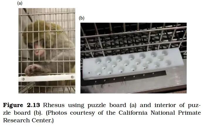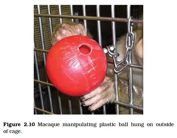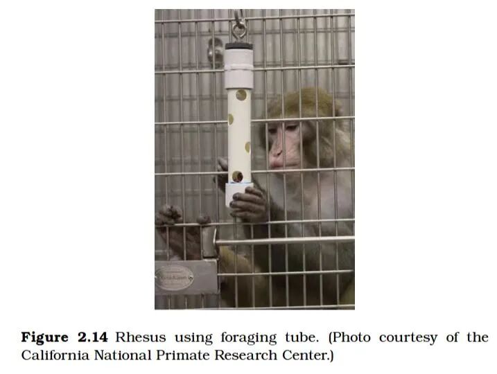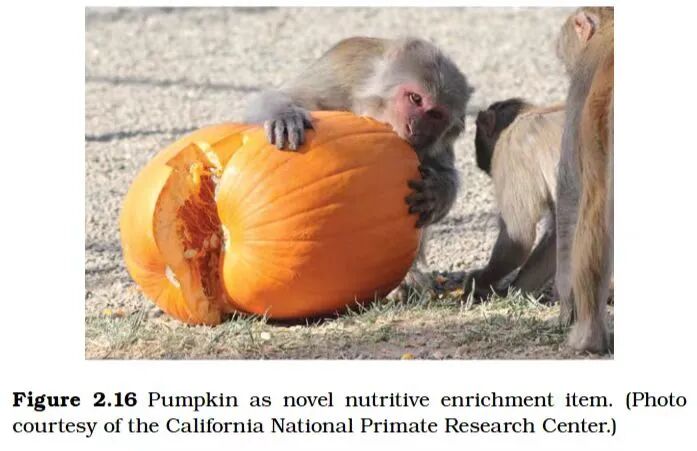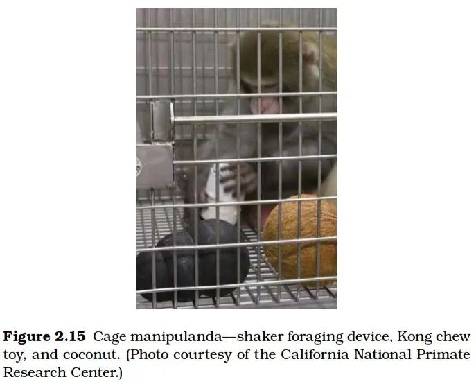 应增加觅食机会,以模拟野生灵长类的时间分配。通过刺激味觉、触觉和嗅觉等新感觉,可增加动物与丰容设备互动的时间(图2.15 和 2.16)。