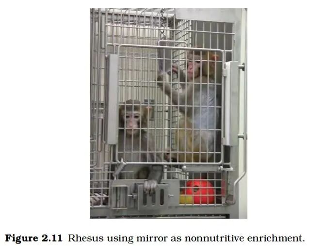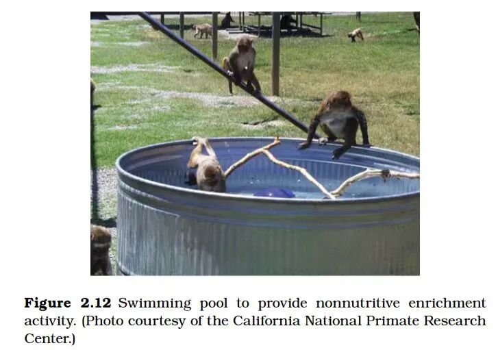可将玩具、镜子或游泳池等非营养性物品放置于笼具内部或附着于笼具上(图2.10至2.12)。若丰容物品放置于笼内,其摆放位置不应影响挤压回缩装置的正常操作。